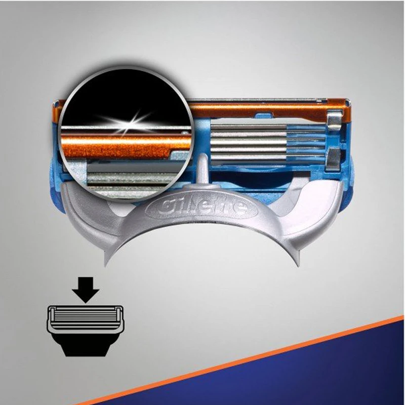 . جنس تیغهها از استیل ضدزنگ است و در برخورد با آب دچار زنگزدگی نمیشود. تیغهای یدک ژیلت برای استفادهی آقایان مناسباند. پنجعددیبودن تیغهها به اصلاحی راحت و سریع و با حداقل تماس با پوست کمک فراوانی میکند. وجود دو عدد نوار ژلی در بالا و پایین تیغهها موجب میشود هنگام خیسشدن، حالتی لیز و ژلهای پیدا کنند. این موضوع به لیزشدن سطح پوست و در نهایت حرکت سریع تیغهها روی پوست منجر میشود و در نهایت به اصلاحی روان، آسان و سریع کمک میکند. نوارهای ژلی از بریدهشدن پوست و ملتهبشدن پوست صورت جلوگیری خواهند کرد. همچنین تیغههای یدک دارای یک لبهی تیغ دقیق در پشت برای ایجاد خط هستند.