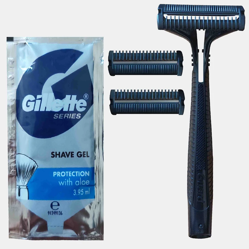 این محصول جدید ژیلت دارای یک دسته و3تیغ یدک میباشددربسته بندی این محصول یک عدد ژل اصلاح هم به وزن 4میلی لیتر موجود است تیغ ژیلت گارد یک ابزار اصلاحی اساسی و در عین حال موثر برای مردان است. طراحی جمع و جور و تک تیغه آن، آن را به گزینه ای عالی برای مردانی تبدیل می کند که یک راه حل اصلاح ساده و مقرون به صرفه را ترجیح می دهند. تیغه تکی خطر تحریک پوست را کاهش می دهد و یک اصلاح نزدیک و راحت ارائه می دهد. طراحی سبک وزن این خودتراش، دست زدن و کنترل آن را آسان می کند و تجربه اصلاح صاف و کارآمد را تضمین می کند. شانه های همراه تیغ باعث محافظت پوست صورت در مقابل هرنوع اسیب وبریدگی میشود تیغ یدک این مدل را جداگانه هم میتوانید تهیه کنید