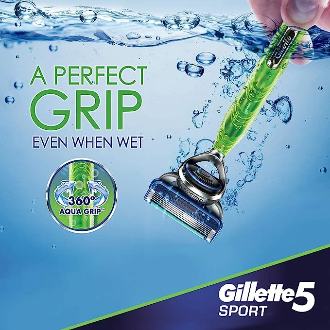 خودتراش Gillette 5 Sport با دسته AQUA-GRIP کنترل کامل خودتراش را بدون لغزش از طریق دسته ژله ای حتی در صورت خیس بودن فراهم می کند . خودتراش Gillette 5 Sport دارای تیغه 5 لبه برای راحتی بهتر در اصلاح است که در مقایسه با خودتراش های 3 تیغه به هم نزدیکتر شده اند . خودتراش Gillette 5 Sport دارای 15 میکرو باله نرم برای کشش ملایم قبل از لمس کردن پوست شما ، برای حداقل تحریک روی پوست است . خودتراش Gillette 5 Sport دارای نوار ژل برای سر خوردن بر روی پوست شما است . در این خودتراش محور جلو برای تقسیم کردن فشار اضافی/ناهموار از دست شما به تیغه ها کمک میکند . دارای 1 عدد تیغ یدک برای استفاده پس از اتمام اولین تیغه است .