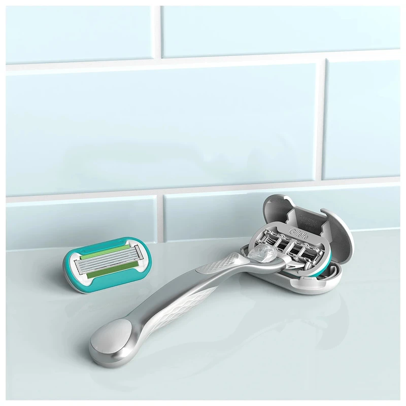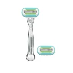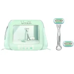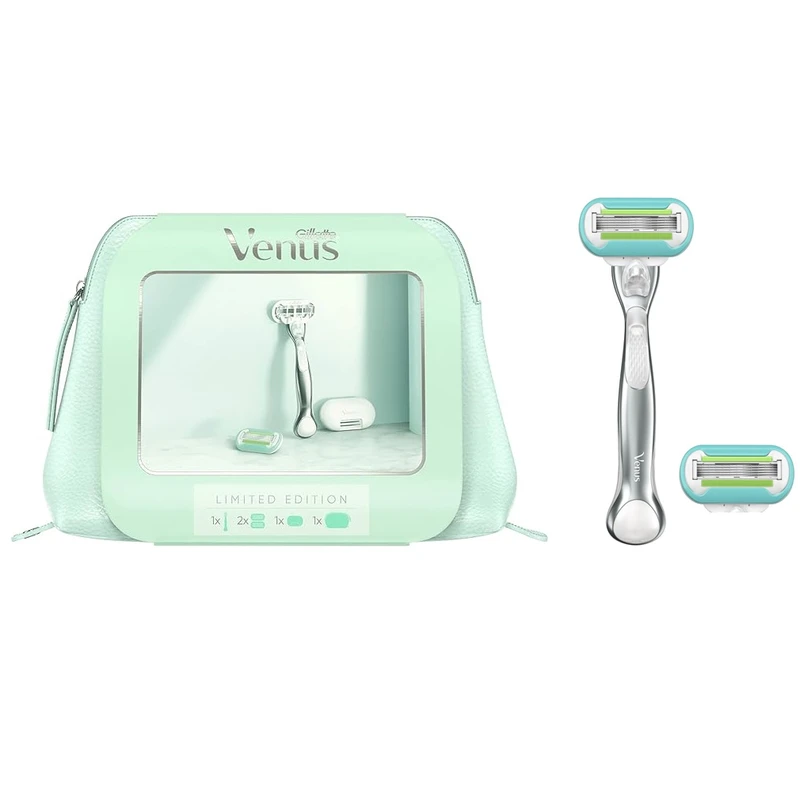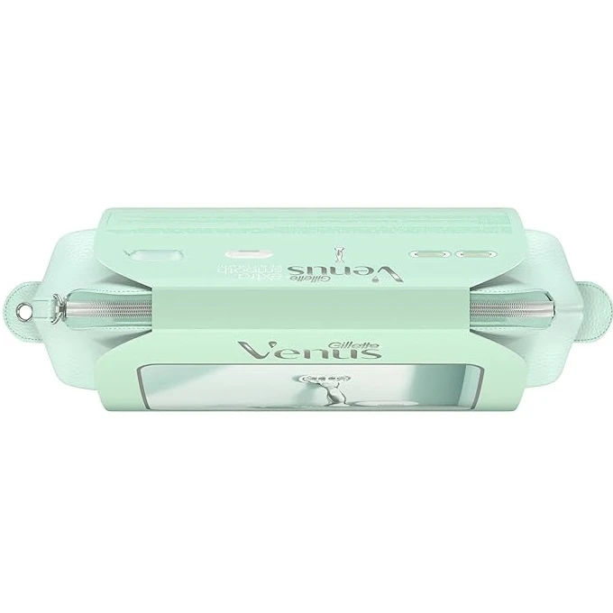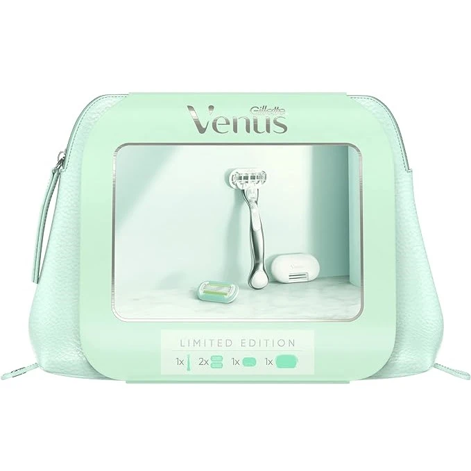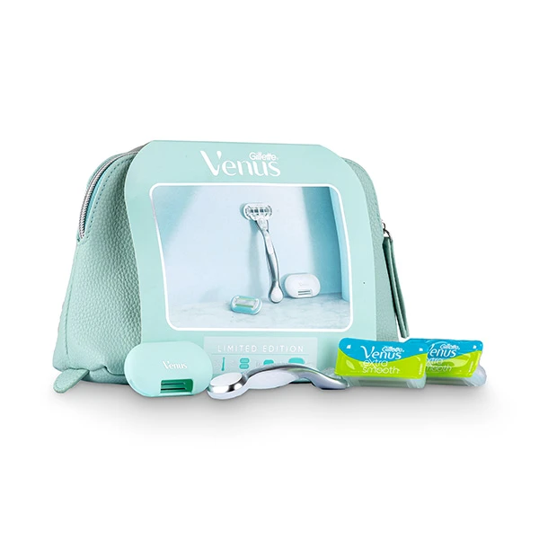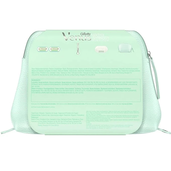 ست متخصص زیبایی اصلاح ژیلت ونوس پلاتینوم شامل : یک عدد خودتراش زنانه ونوس – یک عدد تیغ یدک – یک قاب مسافرتی تیغ – یک کیف . با ست لوکس ژیلت ونوس دلوکس، اصلاح روزانه از موهای خود را دلپذیر و راحت کنید . یک تیغ فوقالعاده ملایم و ظریف، پوستی صاف را که آرزویش را داشتید تضمین میکند . این مجموعه با یک کارتریج قابل تعویض برای دستگاه و همچنین یک نگهدارنده مناسب تیغ یدک تکمیل می شود . تمام محصولات مراقبتی در یک کیف آرایشی ظریف قرار داده شده اند که افزودنی عالی برای زرادخانه زیبایی شما خواهد بود. این ست شامل : – خودتراش 5 تیغه بسیار نازک و تیز که لغزش دقیق و صاف روی پوست را تضمین می کند. – پوشش الماس مانند از بریدگی های تصادفی و میکروتروما جلوگیری می کند. – دسته ارگونومیک برای کارکردن راحت شما – مجهز به سر متحرک که کاملاً خطوط بدن را دنبال می کند و به مناطق صعب العبور می رسد. – دارای نوار روان کننده مخصوص SkinElixir برای اصلاح یکنواخت و صاف . دارای کیف چرمی : – طراحی مد روز با رنگ فیروزه ای ظریف – ساخته شده از چرم ضخیم اکو – مجهز به زیپ قابل اعتماد – برای نگهداری و حمل و نقل محصولات زیبایی شما در نظر گرفته شده است – آسان تمیز میشود.