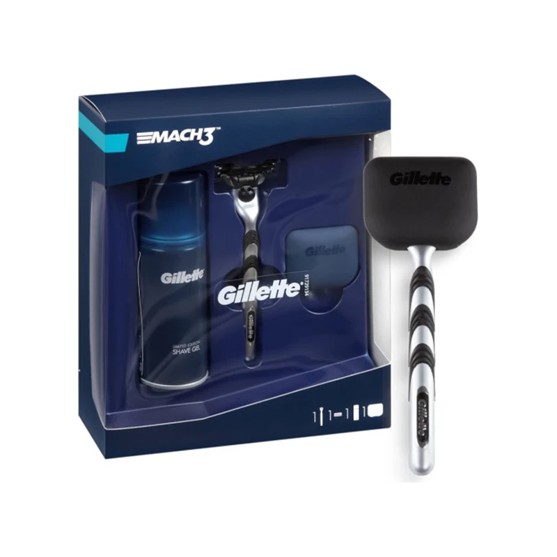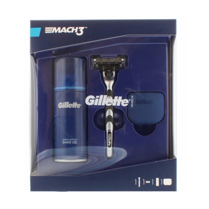 ست اصلاح ژیلت سری MACH3 شامل یک خودتراش ژیلت با سری قابل تعویض و ژل اصلاح خنک کننده و نرم کننده پوست و یک جعبه مسافرتی برای حمل ایمنتر و بهداشتیتر خودتراش میباشد.