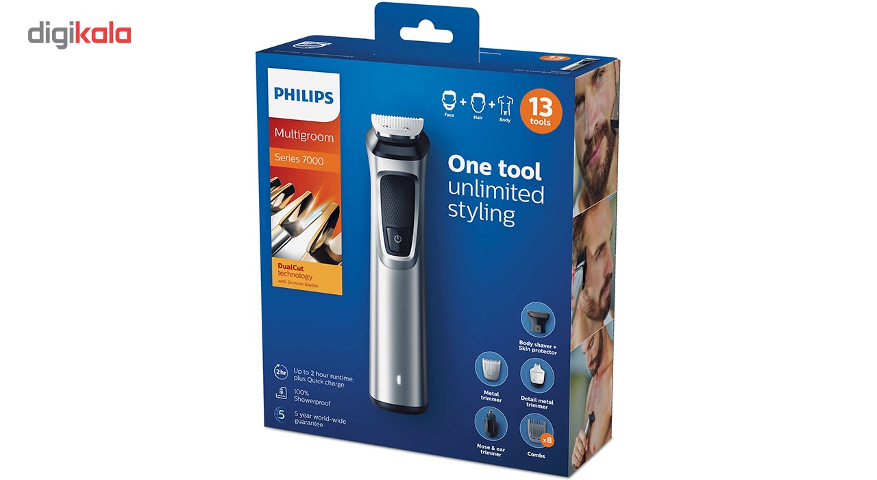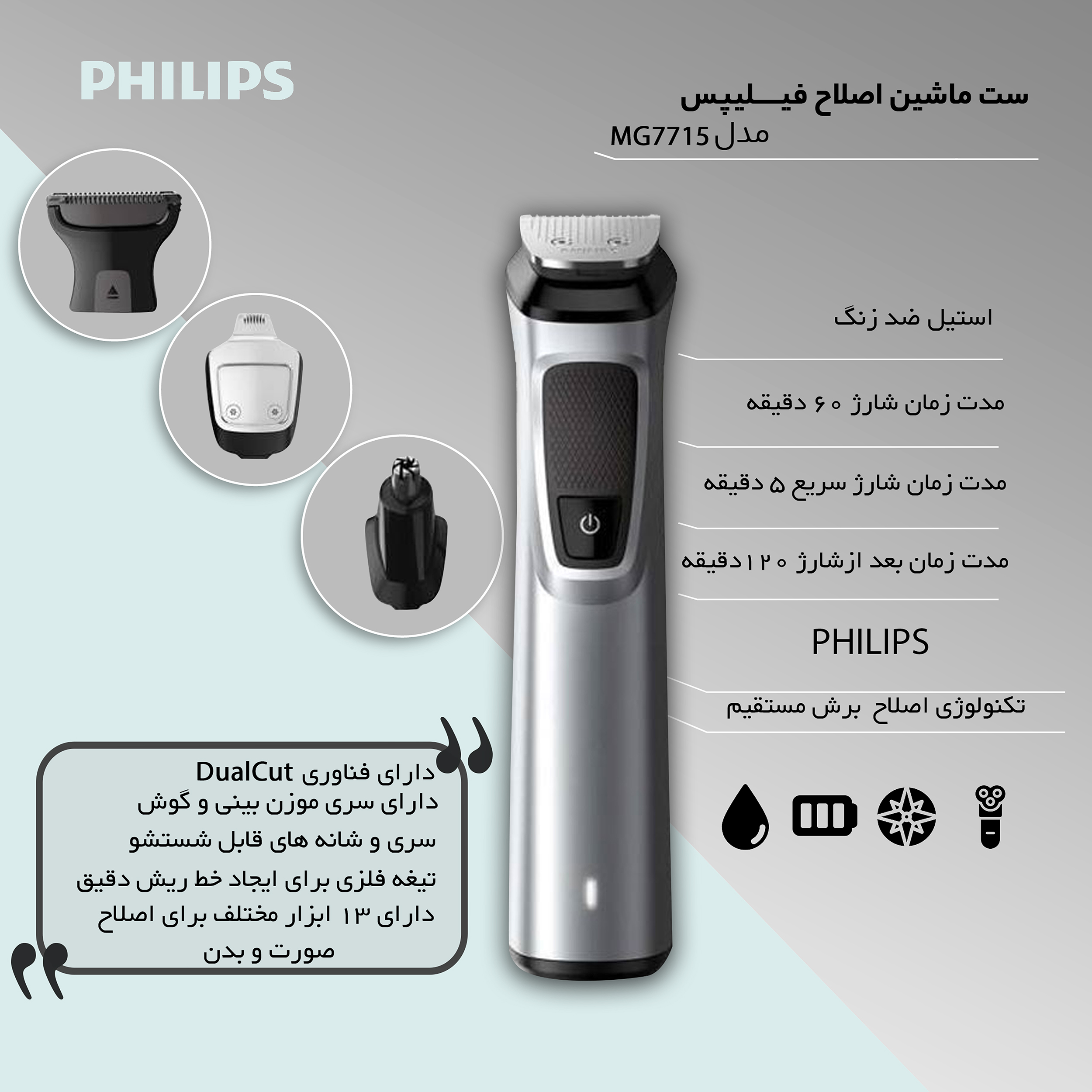 ماشین اصلاح «فیلیپس»‌ (Philips)‌ مدل ‌«MG7715»‌ یک مجموعه‌ی کامل برای اصلاح سر و صورت و بدن است که در مجموع از هشت سری مختلف برخوردار است. می‌توانید بسته به نوع موضع اصلاح، از سری‌های مختلف دستگاه استفاده کنید. اصلی‌ترین سری ماشین اصلاح یک تریمر عریض است که برای اصلاح سر و صورت کاربرد دارد.  پس از استفاده از این سری می‌توان به کمک تریمر باریک‌تر، ریش و سبیل را مرتب کرد. به‌علاوه سری بزرگ‌تری برای اصلاح موهای بدن در نظر گرفته شده است. موزن بینی و گوش هم این مجموعه را تکمیل کرده تا دیگر نیازی به تهیه‌ی یک دستگاه مجزا نداشته باشید. این موزن با برش چرخشی امکان اصلاح سریع و بی‌خطر موهای زائد را فراهم کرده است. از هشت شانه‌ای که به همراه این ست اصلاح ارائه شده، دو  شانه‌ی ته‌ریش (2،1 میلی‌متر)، یک شانه‌ی قابل تنظیم ریش (7،3 میلی‌متر)، سه شانه‌ی مو (9،12،16 میلی‌متر) و دو شانه برای بدن (3،5 میلی‌متر) هستند. فیلیپس قابلیت شارژ سریع را برای این ماشین اصلاح در نظر گرفته و در مواقع عجله می‌توانید با پنج دقیقه شارژ، دستگاه را دوباره راه‌اندازی کنید. شارژ کامل یک ساعت طول می‌کشد و در حالت فول‌شارژ، دستگاه می‌تواند تا 120 دقیقه کار کند.