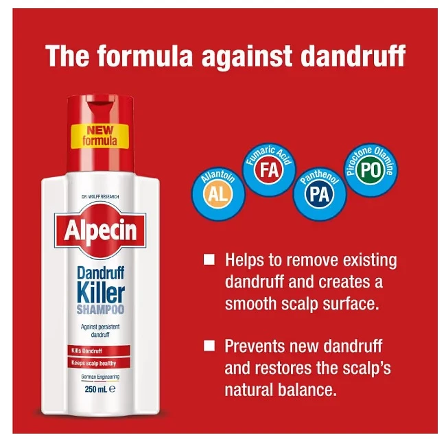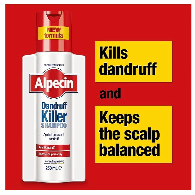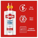شامپو ضد شوره قوی آلپسین Alpecin Dandruff Killer دارای فرمول پیشرفته توسعه یافته در آزمایشگاه دکتر ولف برای پاک کنندگی موثر شوره و جلوگیری از شکل گیری مجدد شوره می باشد. شامپو ضدشوره آلپسین حاوی پیروکتون اولامین برای از بین بردن باکتری ها، قارچ ها و مخمرهای ایجاد کننده خارش و واکنش پوست سر که منجر به تشکیل شوره می شود است و بالانس پوست سر را متعادل می کند. ماده موثر دیگر این فرمول فوماریک اسید برای تقویت اثر گذاری پیروکتون اولامین و پاکسازی شوره های موجود است، این عملکرد باعث می شود کلونی سازی میکرو ارگانیسم ها (قارچ ها و باکتری ها) به طور دائم کاهش یابد و پوست سر هموار و تمیز به وجود آید. عصاره های کلیدی دیگر شامپو ضدشوره آلپسین شامل کافئین برای تقویت و انرژی بخشی ریشه مو برای مقابله با ریزش، آلانتوئین برای افزایش قابلیت حفظ رطوبت در بافت مو و پوست سر، پنتنول برای ترمیم و تقویت ریشه و ساقه مو و عصاره نعناع برای خنک کنندگی و افزایش گردش خون پوست سر است. این فرمول با استفاده منظم از تشکیل و فرم دهی شوره های جدید پوست سر جلوگیری به عمل می آورد. آلپسین برند با قدمت آلمانی تولیدکننده محصولات ضدریزش و تقویت کننده مو است که از سال 1905 در حال فعالیت می باشد. آلپسین توسط دکتر ولف پس از سال ها تحقیقات گسترده در خصوص باکیفیت ترین فرمول ممکن جهت تقویت و جلوگیری از ریزش موی آقایان تاسیس گردید. برای استفاده از شامپو باید آن را روی سر ریخته و ماساژ دهید و سپس بعد از استفاده از آن 3 الی 4 دقیقه بعد می‌توان آبکشی کرد. به طور خلاصه شامپوی Alpecin Dandruff Killer با داشتن مواد مؤثر فراوان در ترکیب خود ضمن از بین بردن شوره‌های موجود از ایجاد شوره‌های جدید جلوگیری می‌کند.