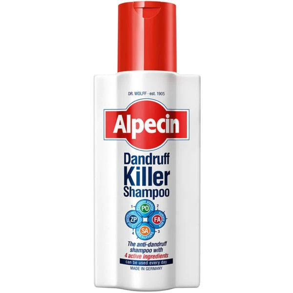 این شامپو اولین شامپوی شرکت معروف آلپسین است که دارای چهار مادهی مؤثر در ترکیب خود است. این مواد به کمک یکدیگر از ایجاد شورهی سر جلوگیری میکنند. دو عدد از این مواد پیریوتیون روی و پیروکتون اولامین هستند که جزو مواد ضد قارچ و ضد باکتری به حساب میآیند. این مواد نقش پیشگیری کنندگی دارند و از به وجود آمدن شورههای جدید جلوگیری میکنند و علاوه بر این تعادل چربی پوست سر را نیز حفظ میکنند. اسید سالیسیلیک و اسید فوماریک نیز دو مادهی دیگر هستند که شورههای ایجادشده روی پوست سر را برطرف میکنند. با برطرف شدن پوستههای اضافی، سطح پوست سر صافتر شده و دیگر مکانی برای رشد میکروارگانیسمها وجود نخواهد داشت. گذشته از این چهار مادهی ذکرشده، مواد دیگری مانند پانتنول، آلانتونین و یک ترکیب انحصاری آلپسین نیز در این شامپو وجود دارد که التهاب پوست سر را کم میکند و به مقاومت آن در برابر عوامل خارجی میافزاید. برای استفاده از شامپو باید آن را روی سر ریخته و ماساژ داد و سپس بعد از استفاده از آن 3 الی 4 دقیقه بعد میتوان آبکشی کرد. به طور خلاصه شامپوی Alpecin Dandruff Killer با داشتن مواد مؤثر فراوان در ترکیب خود ضمن از بین بردن شورههای موجود از ایجاد شورههای جدید جلوگیری میکند.