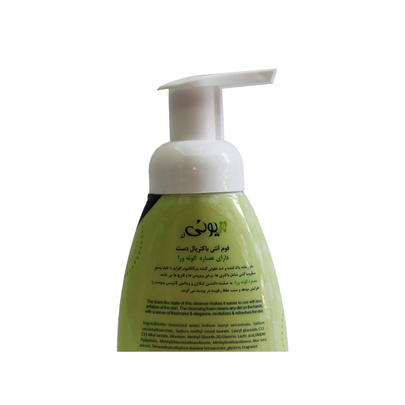 فوم آنتی باکتریال دست آلوئه ورا یونی لد، محصولی بسیار موثر در پاکسازی پوست دست و رفع آلودگی های آن می باشد. این فوم حاوی عصاره آلوئه ورا، کلراید، روغن زیتون و ویتامین E بوده که سبب افزایش نرمی و رطوبت پوست می گردد. فوم آنتی باکتریال دست آلوئه ورا یونی لد طیف گسترده ای از میکروب ها را از بین برده و موجب ایجاد خشکی بر روی پوست نمی گردد.