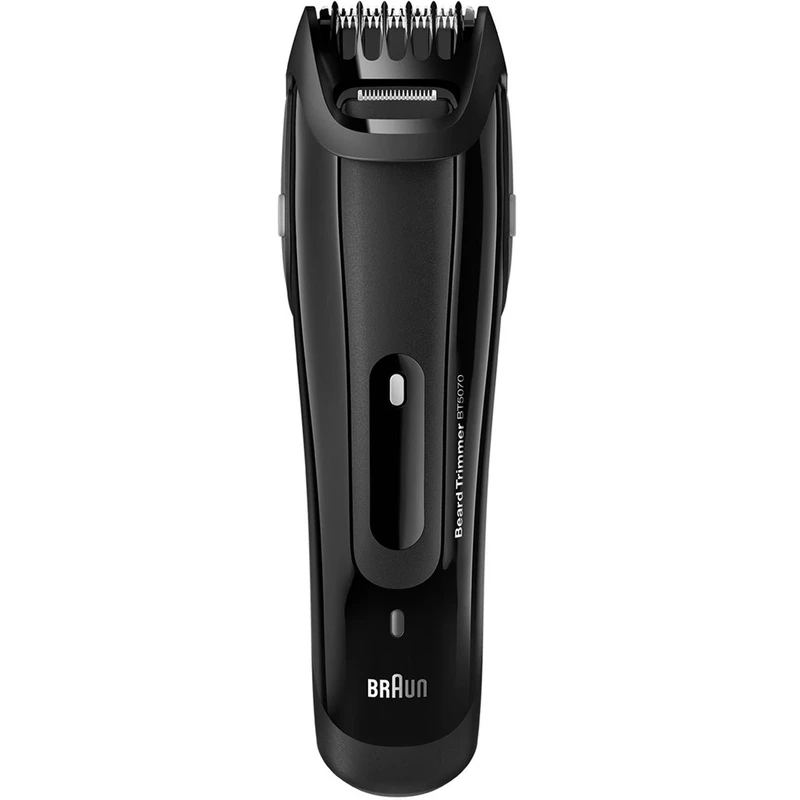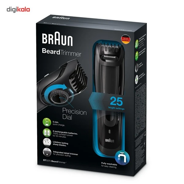 دستگاههای تریمری که برای اصلاح موهای صورت طراحی شدهاند، عموماً خطزنی هستند که شانه های مختلف با طول برش متفاوت روی آن نصب می شوند یا اینکه یک شانه با قابلیت تنظیم ارتفاع برش دارند. اما شرکت براون اقدام به تولید دستگاهی مجهز به دو خط زن کرده که هر کدام استفادهی مخصوص به خود را دارند. Braun BT5070 مجهز به یک خط زن اصلی و یک خط زن کوچکتر قابل استفاده برای مرتب کردن دقیق بعضی نقاط صورت است. خط زن اصلی دندانههای درشتتر و عرض بیشتری دارد و برای اصلاح و خط انداختن موها استفاده میشود. دو عدد شانهی قابل تنظیم برای قرارگیری روی خط زن اصلی وجود دارد که یکی برای اصلاح کوتاه از 1 تا 10 میلیمتر است که درجهبندی 0.5 میلیمتری دارد و دیگری برای اصلاح بلند از 10 تا 20 میلیمتر است و درجهبندی 2 میل متری دارد. تغییر طول اصلاح توسط چرخ درجهبندی دار روی بدنه انجام میشود. خط زن کوچکتر دستگاه با فشار از پایین به بالای آن بیرون میآید و به دلیل عرض کمتر تیغه و دندانههای نزدیکی که به هم دارد برای اصلاح دقیق خط ریش و سبیل بسیار مناسب است. BT5070 مجهز به باتری قابل شارژ است که با 60 دقیقه شارژ کردن میتوان به مدت 50 دقیقه به شکل بیسیم از آن استفاده کرد. با اینکه این دستگاه با برق هم کار میکند، اما اگر شارژ آن تمام شود میتوان با 5 دقیقه شارژ کردن باتری، انرژی لازم برای بیش از یک اصلاح را در آن ذخیره کرد. LED کوچک روی بدنه، کم بودن شارژ باتری و وضعیت شارژ شدن آن را نشان میدهد. این ماشین اصلاح دارای طراحی ارگونومیک است و قسمتهایی از بدنه با پوشش لاستیکی ضد لغزش پوشانده شده که در دست گرفتن و استفاده از آن را راحتتر میکند. برای شستشوی دستگاه میتوان بهراحتی سری خط زن را زیر آب گرفت و شست. به طور خلاصه Braun BT5070 دارای دو خط زن بزرگ و کوچک، دو شانهی قابلنصب روی خط زن اصلی، قابلیت اصلاح موهای سر و صورت با 25 طول اصلاح مختلف، منبع تغذیهی برق و باتری بوده و قابل شستشو است.