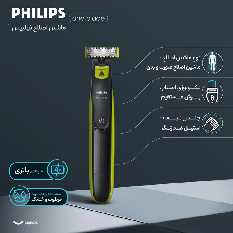 ماشین اصلاح موی صورت و بدن فیلیپس مدل OneBlade، یک ابزار انقلابی و چندمنظوره است که به شما این امکان را می‌دهد تا به راحتی و با دقت، موهای صورت و بدن خود را اصلاح کنید. این تریمر با تکنولوژی برش مستقیم و قابلیت صفر زنی، اصلاحی بی‌نقص و تمیز را ارائه می‌دهد. تیغه‌های استیل ضد زنگ آن، نه تنها دوام بالایی دارند بلکه به شما اطمینان می‌دهند که هر بار اصلاحی راحت و بدون تحریک پوست خواهید داشت. طراحی این دستگاه به گونه‌ای است که می‌توانید از آن به صورت خشک و مرطوب استفاده کنید، که آن را به گزینه‌ای مناسب برای هر سلیقه و نیاز تبدیل می‌کند. فیلیپس OneBlade به همراه کابل شارژ USB ارائه می‌شود و با باتری قابل شارژ خود، در 480 دقیقه به طور کامل شارژ می‌شود و پس از آن به مدت 45 دقیقه قابل استفاده است. با وزن 800 گرمی این دستگاه، استفاده از آن بسیار راحت و آسان است. با ماشین اصلاح فیلیپس OneBlade، هر روز به راحتی و با اطمینان ظاهری آراسته و مرتب را تجربه کنید و از اصلاحی حرفه‌ای و بدون دردسر لذت ببرید.