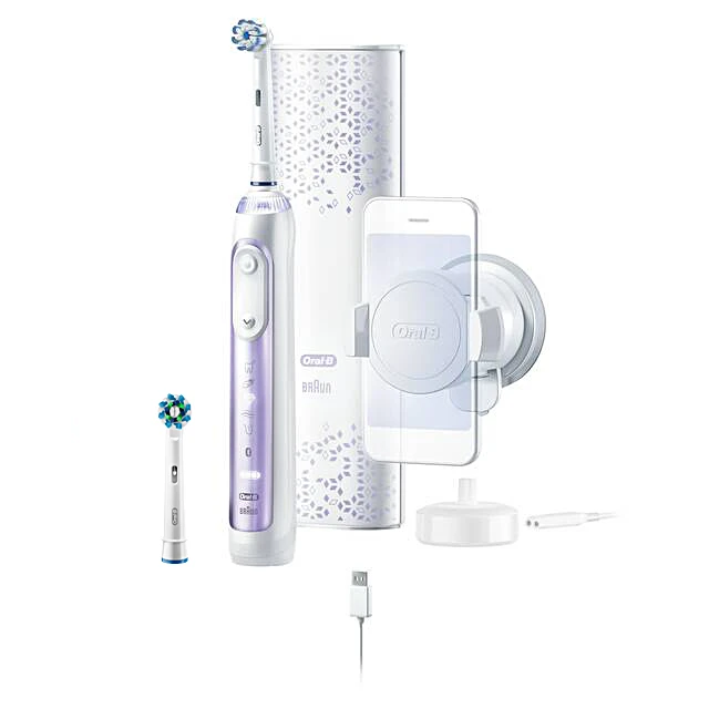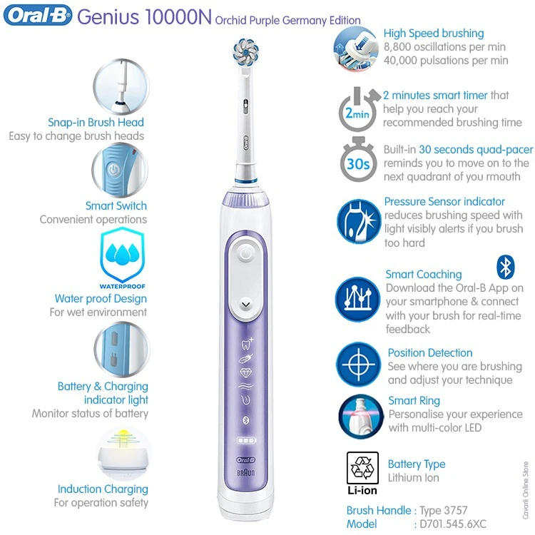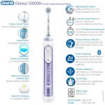 مسواک برقی هوشمند اورال بی GENIUS 10000N بنفش با برس گرد به راحتی فواصل میان دندان ها را تمیز می کند، هر دندان را جداگانه به خوبی پاکسازی می کند و از سلامت لثه ها مراقبت می کند. در مقایسه با مسواک های دستی تا دو برابر سلامت لثه ها را افزایش می دهد و عملکرد مطلوبی در از بین بردن پلاک و باکتری های دندان ارائه می دهد.از اولین روز استفاده سبب سفید شدن دندان ها می گردد و لکه های زرد روی دندان ها را از بین می برد. با تکنولوژی SmartRing و سنسور فشار در صورت فشار محکم لثه به کاربر هشدار می دهد و به طور خودکار سرعت مسواک زدن را کاهش می دهد. در نتیجه از خونریزی و التهابات لثه جلوگیری می کند و هر دندان را با روش درست و بدون فشار زیاد تمیز می کند.