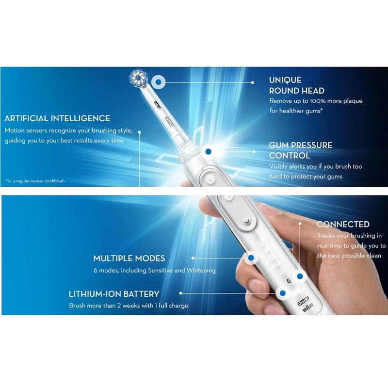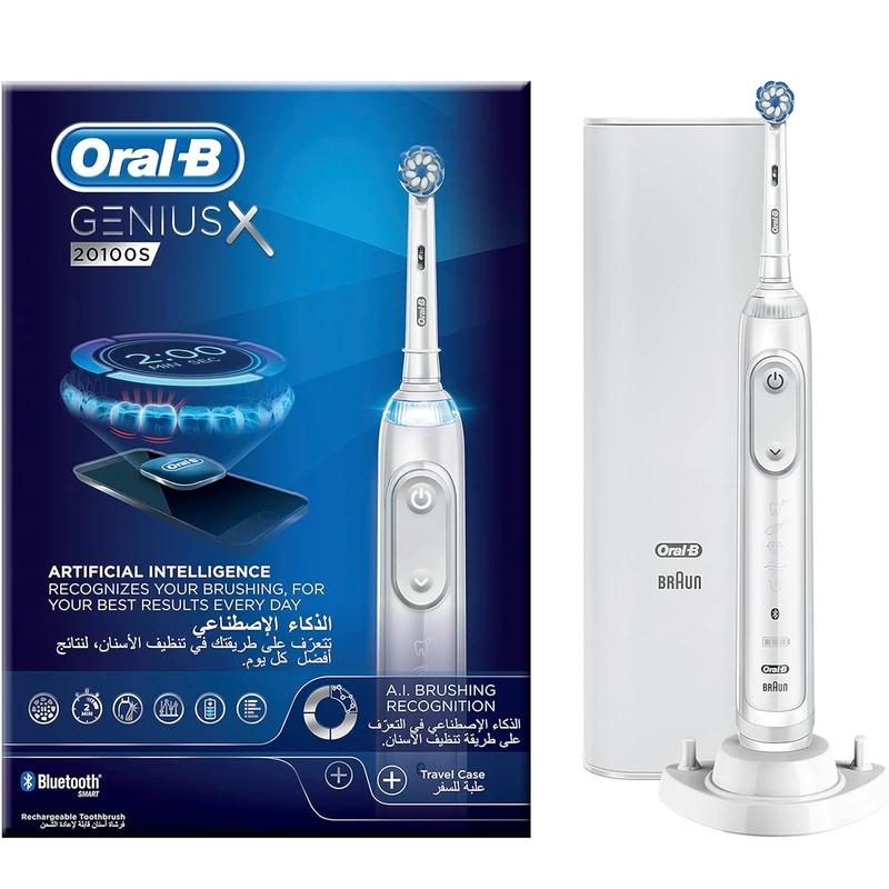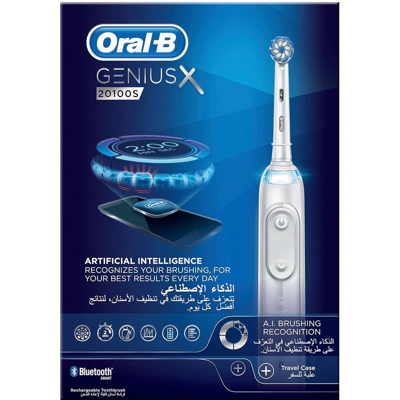 با مسواک برقی Oral-B GENIUS X 20100S از طریق برنامه Oral-B برای اتصال با تلفن هوشمند استفاده کنید تا همانطور که دندانپزشکان توصیه می کنند در مسیر درست مسواک بزنید. Oral-B GENIUS X 20100S دارای فناوری تشخیص موقعیت است که از بلوتوث، تلفن هوشمند و فناوری تشخیص چهره برای ارائه بازخورد تخصصی در مورد عادات مسواک زدن شما استفاده می کند. تشخیص موقعیت به شما کمک می کند بدانید کجا را مسواک زده اید، بنابراین هرگز منطقه ای را از دست نمیدهید. 360 SmartRing با چراغ های LED به شما این امکان را می دهد که تجربه مسواک زدن خود را با انتخاب 12 رنگ شخصی سازی کنید. SmartRing با تایمر و سنسور فشار یکپارچه کار می کند تا بازخورد بصری را در مورد زمان مسواک زدن و فشار مسواک زدن به شما ارائه دهد. این تکنولوژی به شما کمک می کنند تا مطمئن شوید که به مدت 2 دقیقه توصیه شده مسواک بزنید و در عین حال مطمئن شوید که با فشار مناسب مسواک می زنید تا از مسواک زدن بیش از حد از آسیببه لثه ها محافظت کنید.مسواک برقی Oral-B GENIUS X 20100S بسیار پیشرفته دارای سر گردی است که توصیه دندانپزشکان است که هر دندان را با حرکات نوسانی، چرخشی و ضربانی پویا احاطه می کند و تا 500٪ بیشتر از یک مسواک دستی معمولی پلاک را از بین می برد. فناوری سنسور فشار سرعت برس را برای محافظت از لثه کاهش می دهد. سازگار با سرهای برس Oral-B برای رفع هر نوع نیاز مراقبت از دهان و دندان های شما است . سازگار با سری های : Sensetive – Precision Clean – 3D White – Cross Action – Floss Action – TriZone – Pure Clean است . شامل 5 حالت تمیز کردن هر روز لبخند سفیدتر خود را نشان دهید.