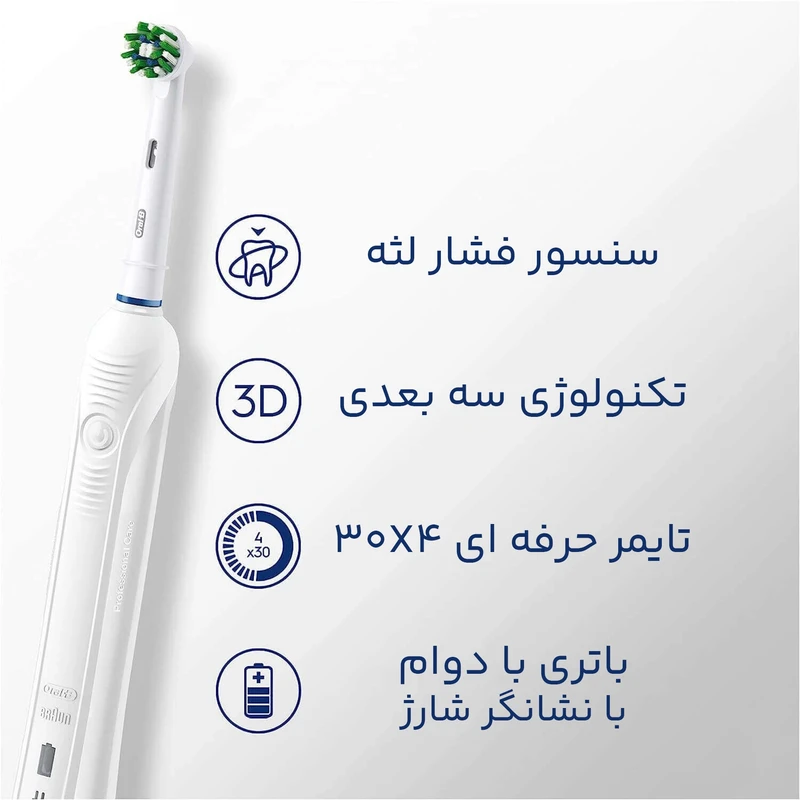 مسواک برقیِ Oral-B Laboratory Professional Clean 1 را از برند مسواک برقی شماره 1 ؛ که توسط دندانپزشکان در سراسر جهان استفاده می شود، امتحان کنید. مسواک برقی Professional Clean 1 به شما کمک می کند طبق توصیه دندانپزشک به لطف تایمر حرفه ای به مدت 2 دقیقه مسواک بزنید و هر 30 ثانیه به شما هشدار می دهد که ناحیه مسواک را تغییر دهید. در حالی که شما به سادگی برس را در داخل دهان حرکت می دهید، سر گرد منحصر به فرد Oral-B بقیه کارها را انجام می دهد. تا 100٪ بیشتر از یک مسواک دستی معمولی پلاک را از بین می برد تا لثه های سالم تری داشته باشد، در حالی که با از بین بردن لکه های سطحی لبخند شما را از روز اول سفیدتر می کند. دسته مسواک شارژی Oral-B Laboratory Professional Clean 1 با سر مسواک های جایگزین زیر سازگار است: CrossAction ، 3D White، Sensi Ultrathin، Precision Clean، Floss Action، Interspace، Ortho Care . تمیز کردن عمیق با فناوری 3 بعدی : سر گرد نوسان می کند، می چرخد و ضربان دارد و تا 100٪ بیشتر از یک مسواک دستی معمولی پلاک را از بین می برد. سنسور فشار داخلی هنگامی که سری مسواک را بر روی دندان بیش از اندازه فشار میدهید سرعت مسواک زدن را کاهش می دهد و اگر بیشتر از حد فشار دهید لرزش ایجاد می کند تا از لثه های شما محافظت کند . این مسواک به شما کمک می کند تا با تایمر 2 دقیقه ای داخلی بهتر و در زمان مناسب تر مسواک بزنید . دارای 3 برنامه مسواک زدن است : تمیز کردن روزانه، سفید کردن و دندان های حساس . Oral-B Laboratory Professional Clean 1 دارای یک سر گرد Sensi Ultra Thin است که به لطف ترکیبی ایده آل از الیاف نرم و منظم، پلاک های دندانی را حتی از نواحی غیرقابل دسترس بدون آسیب رساندن به لثه ها کاملا پاک می کند. همچنین یک سری بسیار کوچک و باریک InterSpace برای تمیز کردن موثر در مناطق بسیار دشوار مانند اطراف بریس ها و ایمپلنت ها و سایر کاربرد های دندانی دارد . هر دندان را با 8800 نوسان و 20000 ضربه در دقیقه برای تمیز کردن سه بعدی درگیر می کند