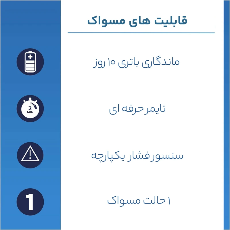 – 1 دسته مسواک برقی – شارژر – 2عدد سری مسواک : دندان و لثه های حساس Sensi UltraThin و بین دندانی بسیار نازک Interspace |