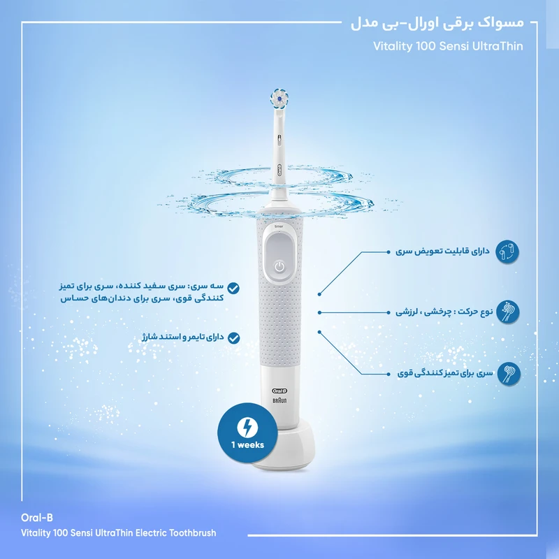 مسواک برقی اورال-بی مدل Vitality 100 Sensi UltraThin، در مقایسه با مسواکهای معمولی پلاک و باکتری بیشتری را تمیز میکند و قدرت تمیزکنندگی دو بعدی دندانها را دارد. این مسواک با حرکات لرزشی و چرخشی، باقیمانده مواد غذایی فواصل میان دندانها را عمیقا پاک میکند و از این طریق مانع پوسیدگی و خرابی زود هنگام دندانها میشود. بدنه مسواک برقی اورال-بی مدل Vitality 100 Sensi UltraThin، دارای تایمر هشداردهنده 2 دقیقهای است و مدت زمان مناسب برای مسواک زدن دندانها را مشخص میکند. به علاوه هر 30 ثانیه یک بار با حرکات لرزشی، هشدار میدهد تا به سمت دندان بعدی بروید و از این طریق از التهابات لثه و بیش از حد تمیز کردن دندانها جلوگیری میکند. از دیگر مزایای خوب این محصول میتوان به طراحی ارگونومیک بدنه اشاره کرد که در حین پاکسازی دندانها از اذیت و خسته شدن دست جلوگیری میکند. این مسواک بدنه ضد آب دارد و با تمام سریهای یدک اورال-بی سازگار است.