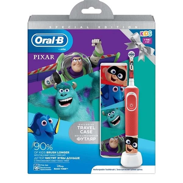 مسواک برقی اورال-بی با طرح جذاب کودک پسند وبا الهام از انیمیشن محبوب بچها (Pixar) طراحی شده تا کودک را ترغیب به مسواک زدن کند.علاوه بر این مسواک موزیکال هست و هنگام مسواک زدن کودک آهنگ پخش می کند.زمان مسواک زدن استاندارد 2دقیقه هست وبعد از یک دقیقه مسواک زدن کودک، آهنگ شادی پخش می شود که نشان دهنده زمان تغییر مسواک زدن از فک بالا به پایین هست که این موزیکال بودن بزرگترین ترغیب کننده کودک خواهد بود.سری این مسواک کوچک بوده و الیاف سری نرم و لطیف هست که به لثه های کودکان هیچ آسیبی نمی زند و دندان را از هرگونه جرم و پلاکی تمیز می کند و بهداشت دهان ودندان فرزندان شما را تضمین خواهد کرد.این مسواک مناسب کودکان 3 سال و3سال به بالا هست که در هر مرحله از رشد دندان های کودک خود می توانید استفاده کنید و از خرید هرگونه مسواکی تا سال ها بی نیاز خواهد بود.اورال-بی در آخرین بروزرسانی های خود وبرای جذابتر کردن مسواک زدن برای کودکان یک اپلیکیشن به نام Disney Magic Timer by Oral-B طراحی کرده ،که به هنگام مسواک زدن تلفن همراه یا تبلت به مسواک وصل می شود و کودک دلیندتان را به هنگام مسواک زدن سرگرم خواهد کرد و آن را به مسواک زدن ترغیب خواهد کرد.این اپلیکیشن را می توانید از گوگل پلی یا اپ استور دانلود کنید.