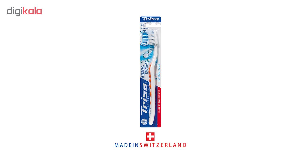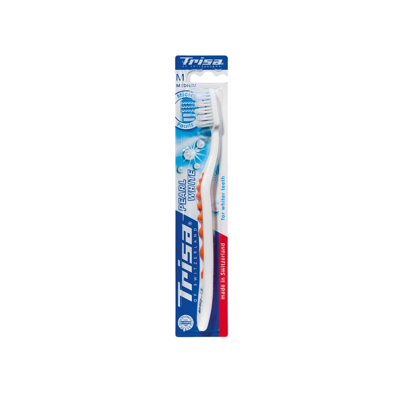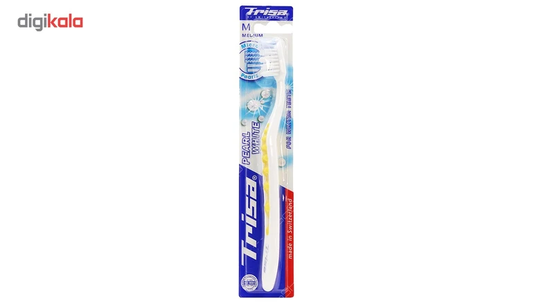مسواک مدل «Pearl White» از برند «تریزا» (Trisa) طراحی ساده و دقیقی دارد. این مسواک با دستهی ارگونومیک و راحت دارای الیافی با میزان زبری متوسط است. برش لیفهای آن منطبق با آناتومی طبیعی دندانها صورت گرفته است. ویژگی این مسواک وجود الیاف با دانههای آبیرنگ برای سفیدکردن دندانهاست. دستهی این مسواک به صورت موجیشکل طراحی شده که از لغزش مسواک در دست، هنگام استفاده از آن جلوگیری میکند. مسواک پرل وایت دارای دو ردیف الیاف بلند برای تمیزکردن نقاط بین دندانها و الیاف کوتاه برای تمیزکردن سطوح دندان است. این مسواک با طراحی ساده ولی ویژهای که دارد، انتخاب مناسبی برای تمام افراد است. مسواک تریزا در رنگهای مختلف عرضه شده و برای کل خانواده به تفکیک قابلاستفاده است. این مسواک درپوش و پد تمیزکننده ندارد. مسواک تریزا با کیفیت خوب، انتخاب خوبی برای بزرگسالان خواهد بود.